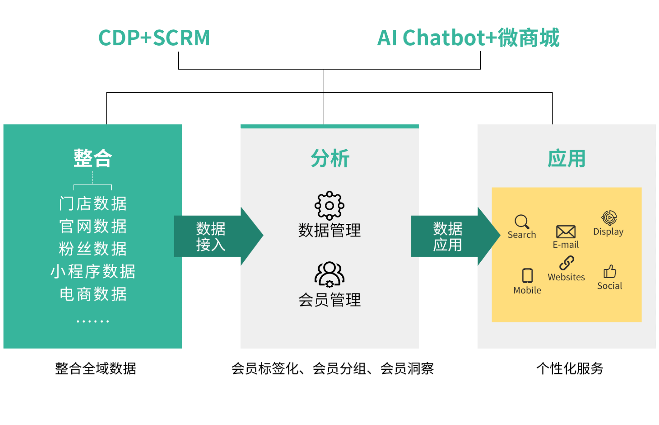 利用CDP实现数据资产沉淀与管理,利用SCRM实现会员精细化管理,利用AI聊天机器人、微商城、智能推荐等数据应用提升用户体验,提高营销效率。
