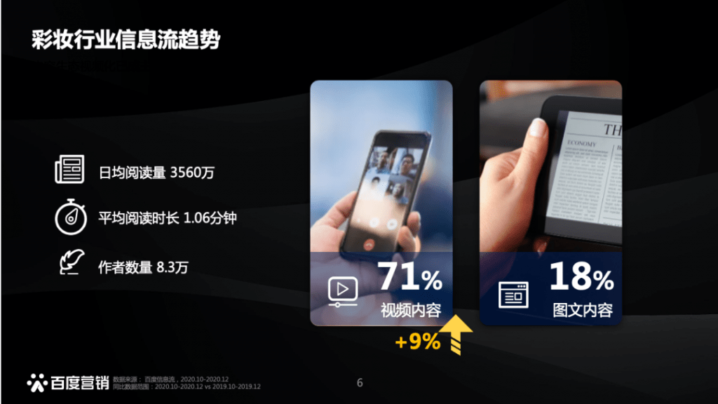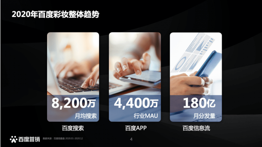 百度上活跃着大量关注彩妆行业的人群,仅手机百度APP端月活跃人数就高达4400万,用户行为呈现出主动搜索和刷信息流的双向路径,信息流月均分发180亿次,彩妆相关词的月均检索量为8200万次。