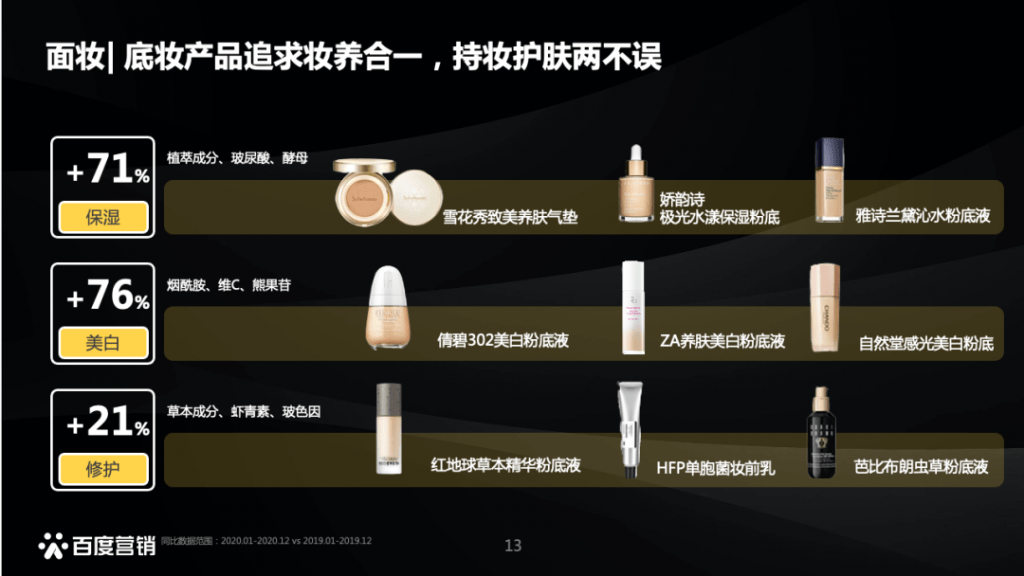 从2019年刮起“养妆”的风潮,在2020年得到进一步发酵。底妆产品的养肤功效呈现细分趋势,保湿、美白、修护是主打“妆养合一”概念的三条主赛道。与此同时,用户还会关注产品营销卖点背后真正起到功效支持的养肤成分,例如玻尿酸、烟酰胺、虾青素等,这些都是与养妆产品高频关联的热门成分。
