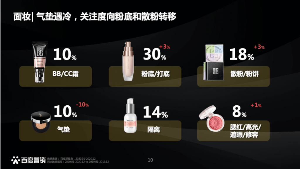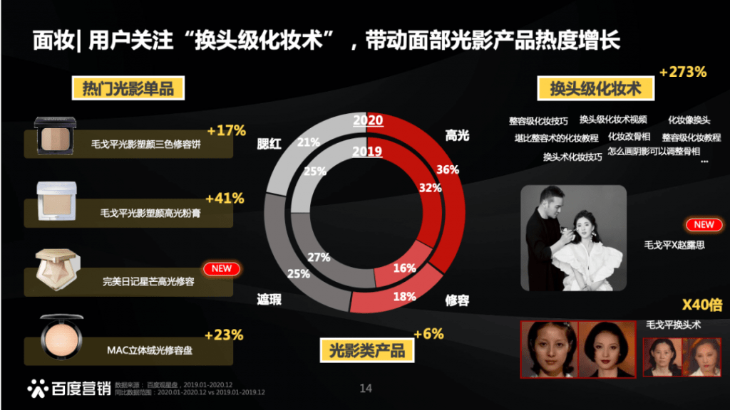 “换头术”是网友们赐予大师级化妆技术的昵称,在2020年,与之相关的检索量同比上升了近3倍。这一热点话题同时拉动了实现“换头术”效果的产品的检索量。高光和修容在光影类产品中的占比相较2019年提升了6%。市场上的明星光影单品同样引起了百度用户的注意,检索量同比2019年都有显著的增长。