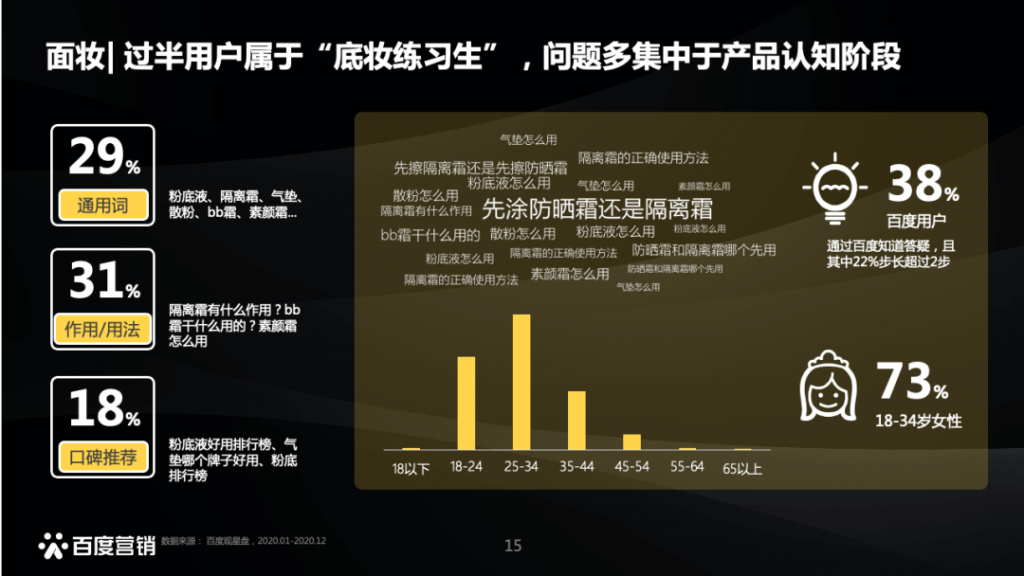 对检索面部彩妆问题的用户进行人群分析,可以发现,过半用户的问题仍集中于产品认知阶段,例如“防晒和隔离的区别”,“气垫与粉底怎么使用”,“素颜霜是什么产品”等,都是高频检索词。其中,73%的用户是18-34岁的女性,属于彩妆行业的核心人群,若对这些“底妆练习生”通过有效的方式引导,她们出道成为彩妆高手将指日可待。那么,什么是有效的方式呢?进一步探索她们的行为路径可以发现,近4成的用户通过百度知道释疑,且其中22%阅读了不止一篇“知道贴”。所以,大家get到小编的“疯狂暗示”了吗?