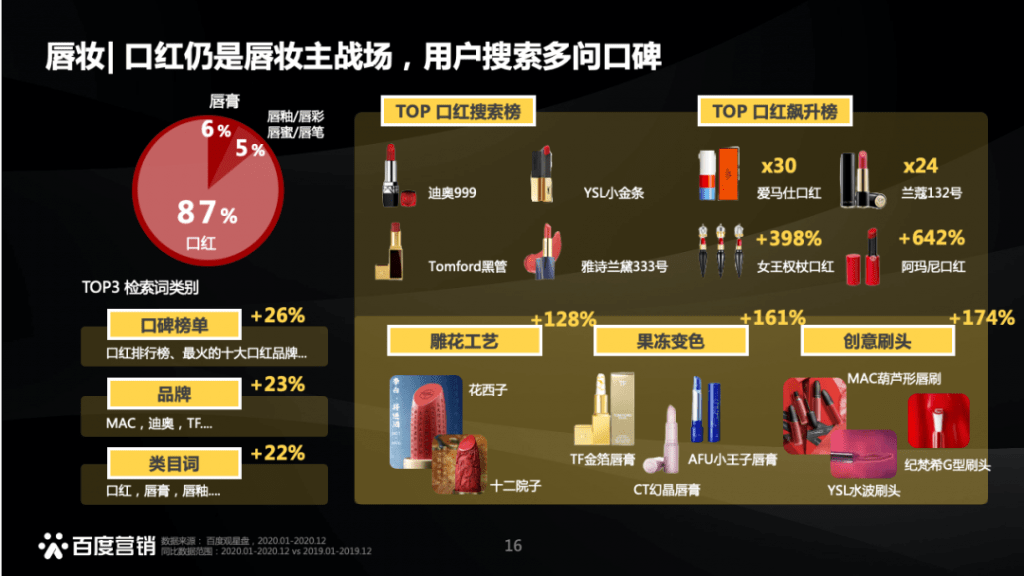 口红是唇部彩妆当之无愧的主战场,近9成的检索都集中在口红相关的问题上。高奢口红的热度飙升,同时,雕花工艺、果冻变色、创意唇刷等关键词都是引发用户关注的唇妆热门议题。