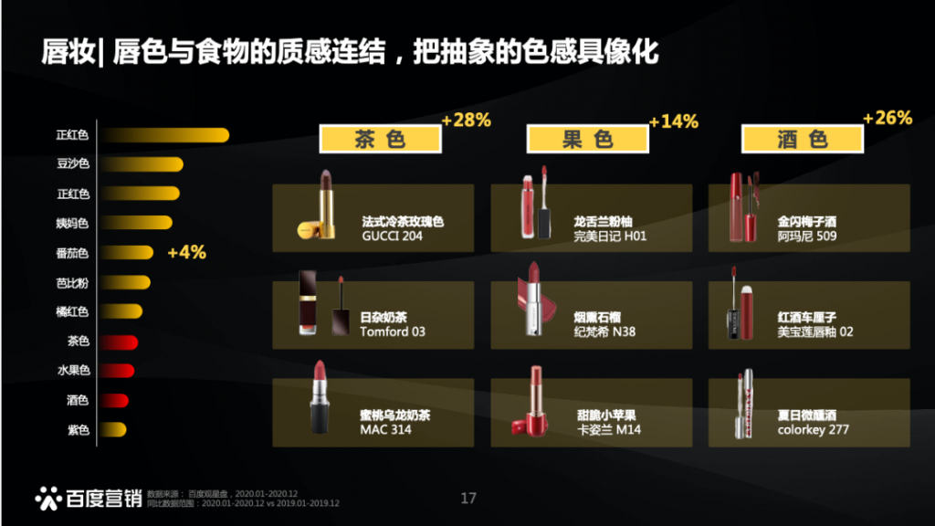 “求口红色号”是最近弹幕常出现的刷屏词。2020年,“食物感唇色”成为了一股新风潮,抽象的色彩与具象化的美食联结,即便用户无法亲身试色,也能拥有无限遐想与期待的空间。各大品牌同样敏锐地捕捉到了这一动向,从而纷纷推出茶色、果色、酒色类的唇色响应市场的需求。