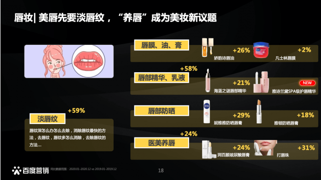 随着小姐姐们对妆容精致度“更上一层楼”的要求,涌现出了“养唇”这一新议题。传统的唇膏已经不能满足淡唇纹的需求,品牌纷纷推出唇部精华、乳液、防晒类的养唇进阶产品并同步得到了用户的关注。