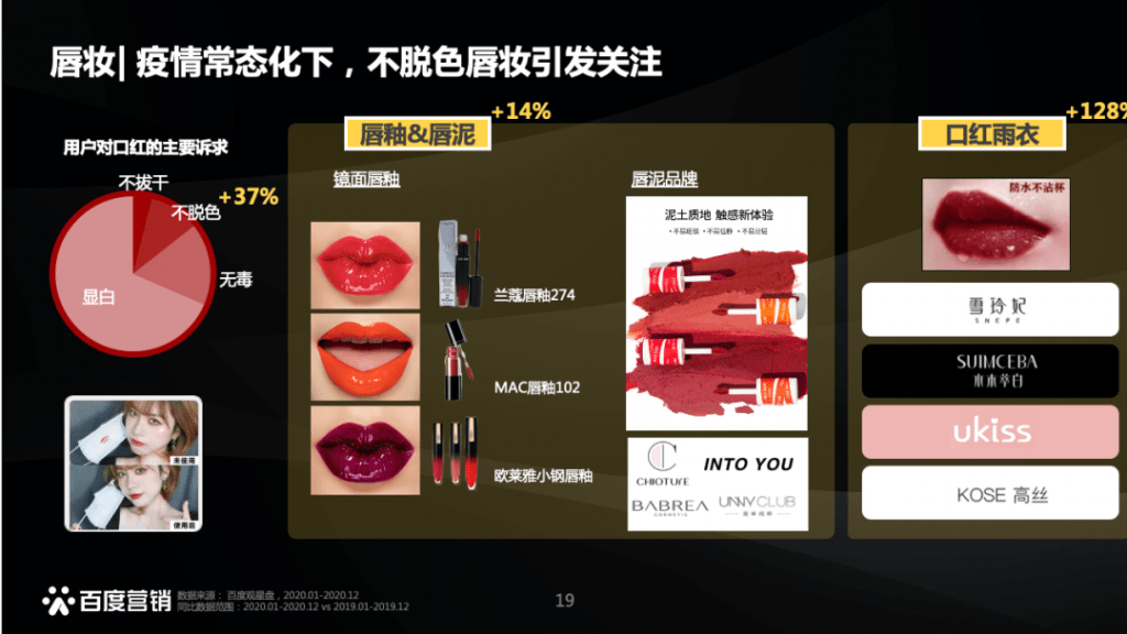 对于持妆的需求,不仅体现在底妆上,更加适用于唇妆。用户对口红“不脱色”的关注度同比上升了37%。与此同时,能够有效持妆的唇釉,唇泥,口红雨衣类产品热度上升,尤其是唇泥,作为2020年新出现的子品类,潜力巨大。