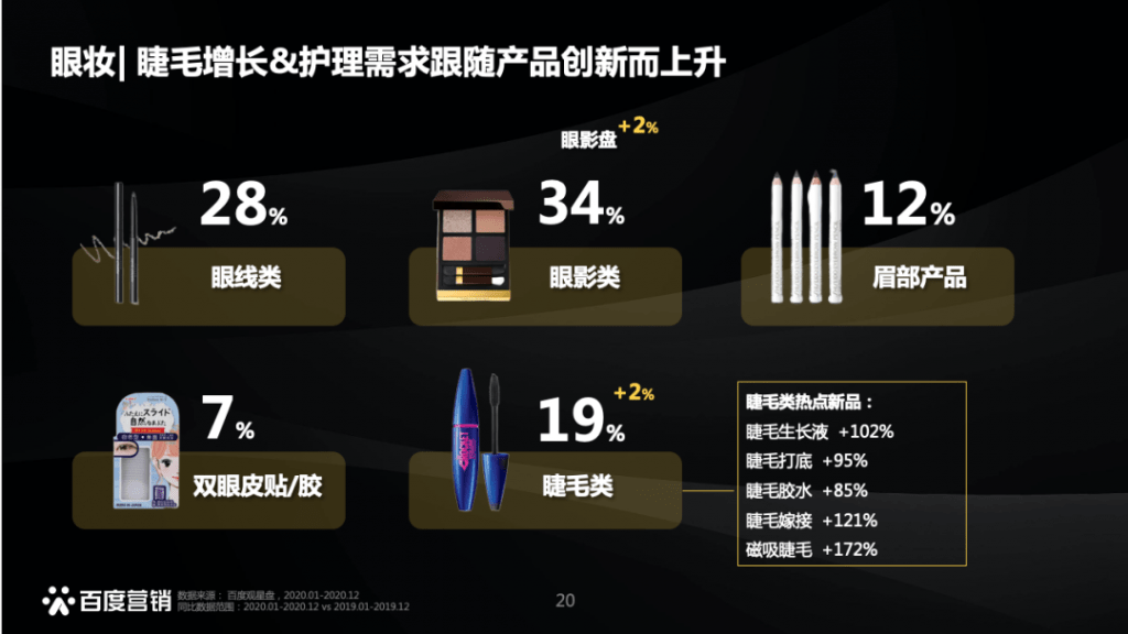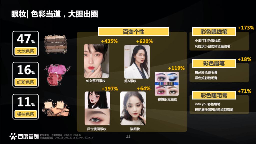 2020年,在眼妆色彩的选择上,除了主流的大地色、红粉色和橘柚色系,小仙女们还根据热剧和热综开发出一系列个性妆容,例如“仙女落泪”、“超A眼妆”、“赛博朋克”等眼妆收获了大量用户的关注。与此同时,对于色彩的追求已经不仅限于眼影,更延伸到了眼线、眉、睫毛等眼部其他部位,品牌紧跟市场需求的步伐,相关产品应运而生,并反馈在百度用户的检索行为上。
