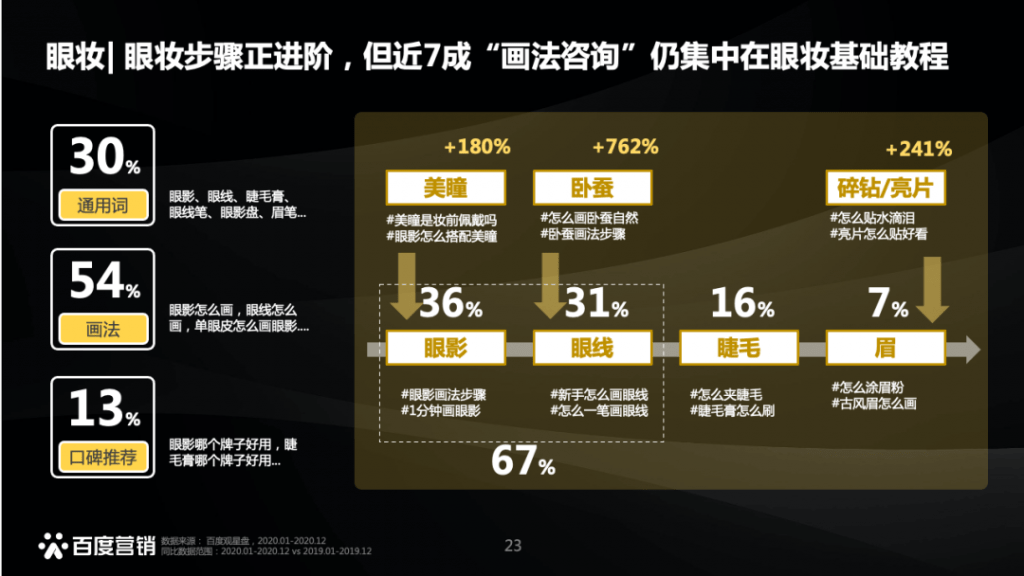 百度用户有关眼妆的检索,超过半数集中在“画法”相关的问题上。对检索词进行聚类分析,可以发现,眼妆的画法步骤有明显的进阶趋势,美瞳、卧蚕、碎钻等关注度飙升,已经成为眼妆不可缺少的部分。但与此同时,我们发现有67%的检索量仍集中在眼影和眼线的基础教程上,由此可见,化妆新手仍是主力军。