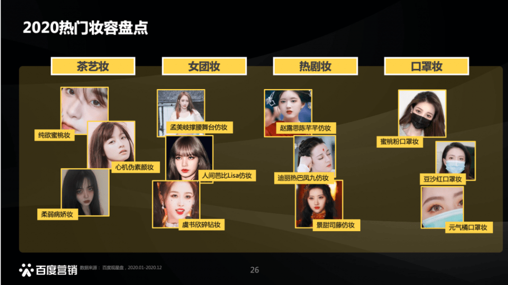 热门妆容总能把握时尚的风口,踩在时代的最前沿。随着创造101系列选秀节目的爆火,陈芊芊的一袭红装出圈,小仙女们也将各类她们心水的明星和剧作人物妆容完美复刻到日常生活中。我们根据百度用户的检索行为进行聚类分析,发现四大最热门的妆容分别是茶艺妆、女团妆、热剧妆和口罩妆。