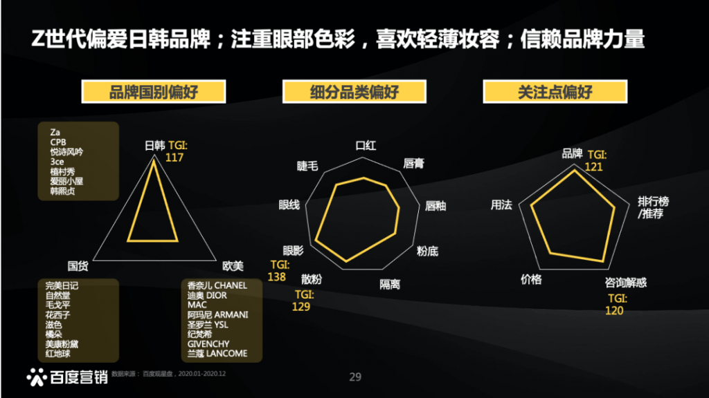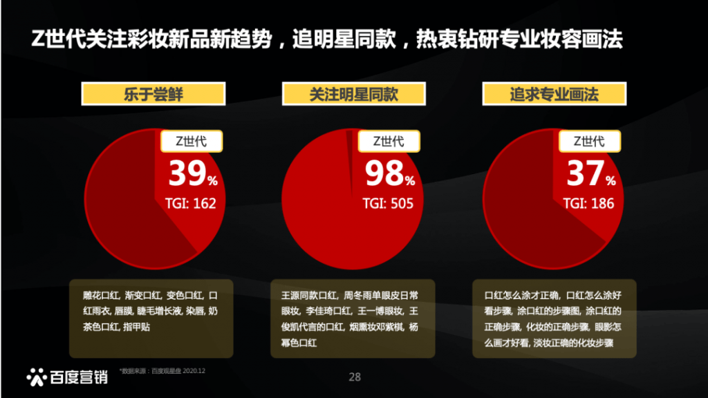 进一步分析Z世代人群在彩妆行业的行为特质,发现最为显著的一项就是:关注明星同款。这一点与上述“半数Z世代爱追剧”的发现不谋而合,“明星”果然是俘获年轻人芳心的利器呢!此外,百度悄悄记录了少男少女们的好奇心,近40%对于最新产品、品类的检索量都是Z世代人群贡献的。除了乐于尝鲜,年轻人们也是追求专业技法的“好学生”,在化妆这件事上,年轻人可是颇具匠心精神呢。