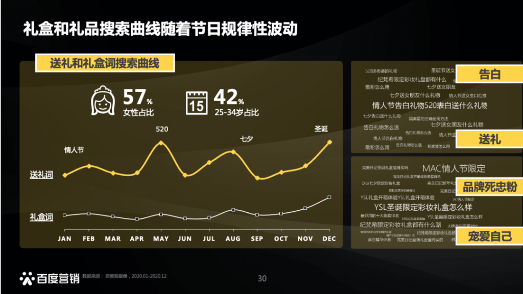 节日送礼,已经成为了我们日常生活中的常驻议题。在百度上,有关送礼和礼盒的检索峰值与节日显著正相关。尤其是520和圣诞,大量的男士会来百度搜索如何送礼,如何告白,让度娘为他们助攻支招。与此同时,通过人群分析,我们发现其中半数是女性,她们在节日同样会关注自己挚爱品牌的限定礼盒,专属营销活动。精致的单身贵族也会选择在这些具有仪式感的日子,壕气出手,宠爱自己。