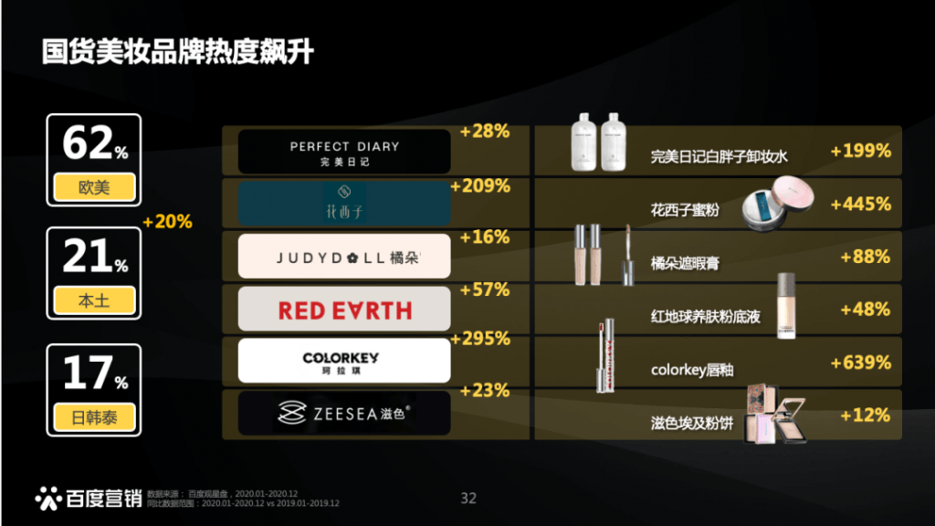 2020年见证了诸多国货美妆品牌的崛起:花西子、珂拉琪等品牌的品牌声量同比增长超200%;已经火遍大江南北的完美日记,检索量持续增长。除了品牌占据了用户的心智高地之外,各大品牌的明星产品同样获得了用户的大量关注。