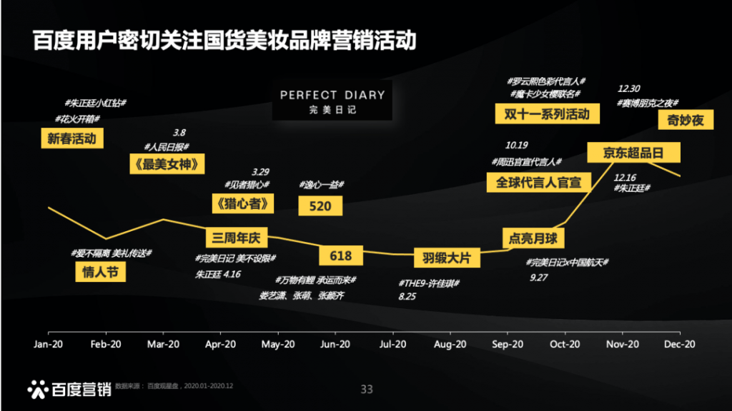 我们将百度指数与品牌的营销活动进行关联度分析,以完美日记2020年全年的营销大事件为例,可以发现,用户会来百度进一步深入了解品牌的活动详情,尤其是在春节和双十一的关口,检索量会呈现爆发式增长。