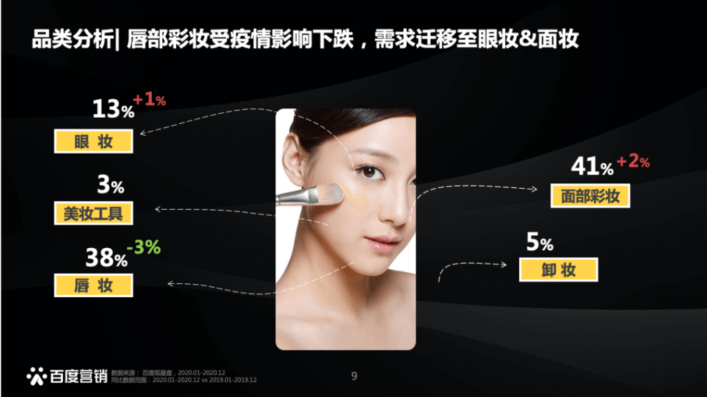 百度平台上,用户对于面部彩妆的关注度最高,占41%;其次是唇妆,占38%。2020年,受疫情影响,由于口罩成为了出行的日常装备,用户对于唇部彩妆的关注有所下降,而面部彩妆和眼妆的关注度占比分别提升了2%和1%。
