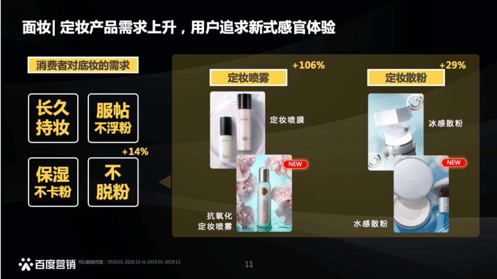 2020年,由于戴口罩成了出行的刚需,用户对于定妆产品的需求激增。通过对底妆检索的关注点进行聚类分析,“不脱粉”一项同比上升了14%。与此同时,市场同样反应迅速,涌现出一系列带有新式感官体验的定妆类新产品,例如抗氧化定妆喷雾、水感冰感散粉。