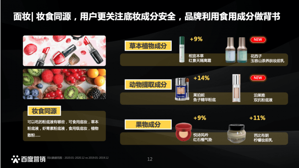 疫情的爆发进一步提升了全社会对于健康和安全的关注,这一议题同样反馈在彩妆行业上。大量的用户来百度搜索例如“食用级底妆”等关键词,品牌同样抓住了这一痛点,利用食用成分为产品安全做背书。其中草本成分、动物提取成分和果物成分是品牌和用户共同关注的热门食用成分。